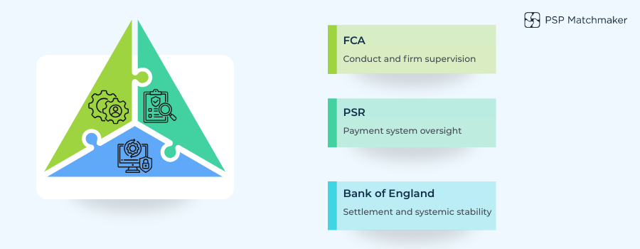 The FCA is not the only authority involved in UK payments, and its role is often misunderstood in isolation. The FCA focuses on conduct regulation and firm supervision. It assesses how payment services firms behave, manage risk, and treat customers.